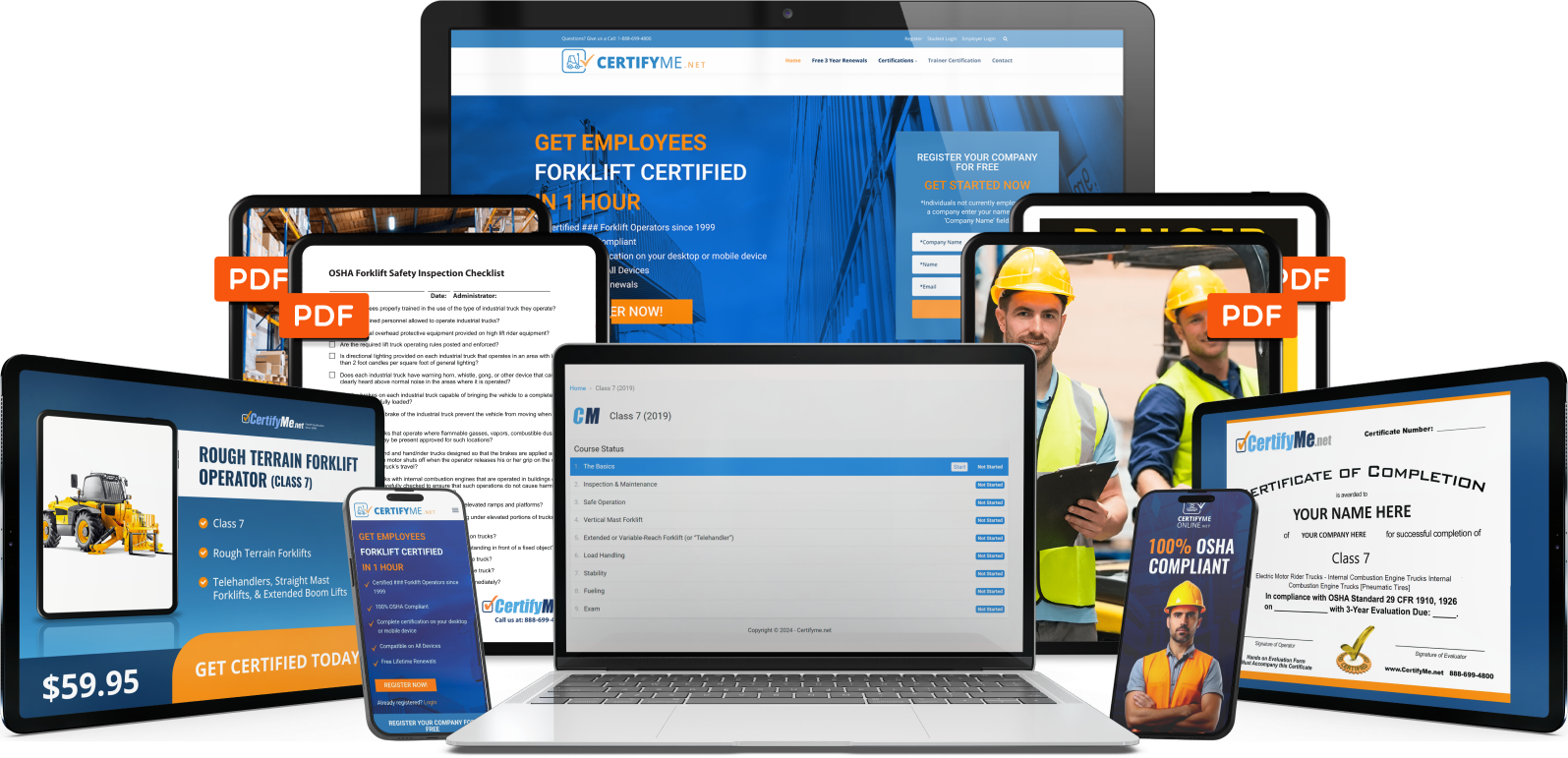 CertifyMe.net, the leader in online forklift certification. Our easy, affordable process ensures all your workers have Class 7 rough terrain forklift certification and training. It’s just one of the